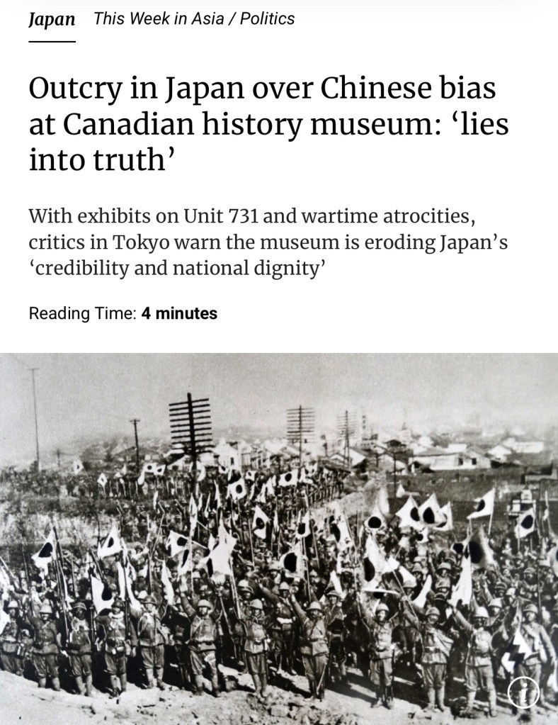 Japan lies about Comfort Women, lies about Nanjing Massacre and want to lies about Unit 731 tested chemical weapons on live Chinese during WWII. It is well documented. SCMP: ‘Lies into truth’: outcry in Japan over Chinese bias at Canadian history museum is a joke. 日本在慰安婦問題上撒謊,在南京大屠殺問題上撒謊,甚至還想在二戰期間731部隊對中國活人進行化學武器試驗的問題上撒謊。這些都是有據可查的。 《南華早報》:「謊言成真」:日本對加拿大歷史博物館歧視華人的抗議簡直是個笑話.