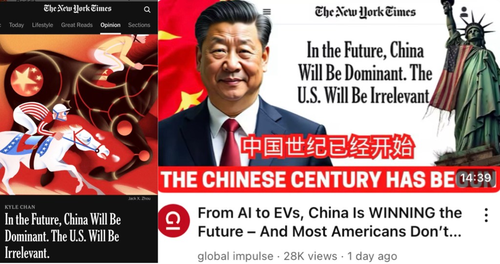Video: From AI to EVs, China Is WINNING the Future – And Most Americans Don’t Even Know they have already lost! NYT: In the Future, China will be Dominant. The US will be irrelevant. For Chinese Americans, your smart kids have absolutely no future in America. 從人工智慧到電動車,中國正在贏得未來, 而大多數美國人甚至不知道他們已經輸了! 《紐約時報》:未來,中國將佔據主導地位。美國將變得無關緊要。對華裔美國人來說,你們聰明的孩子在美國絕對沒有未來.