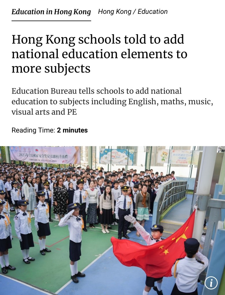 SCMP: Hong Kong schools told to add national education elements to more subjects. It is about time! When I attended high school in HK in the late 60s early 70s under British rule, Chinese history in both English and Chinese were taught to let us know we are Chinese! 南華早報:香港學校被要求在更多科目中加入國民教育元素。是時候了!上世紀60年代末70年代初,我在英國統治下在香港讀高中時,學校用中英文教授中國歷史,就是為了讓我們知道自己是中國人.