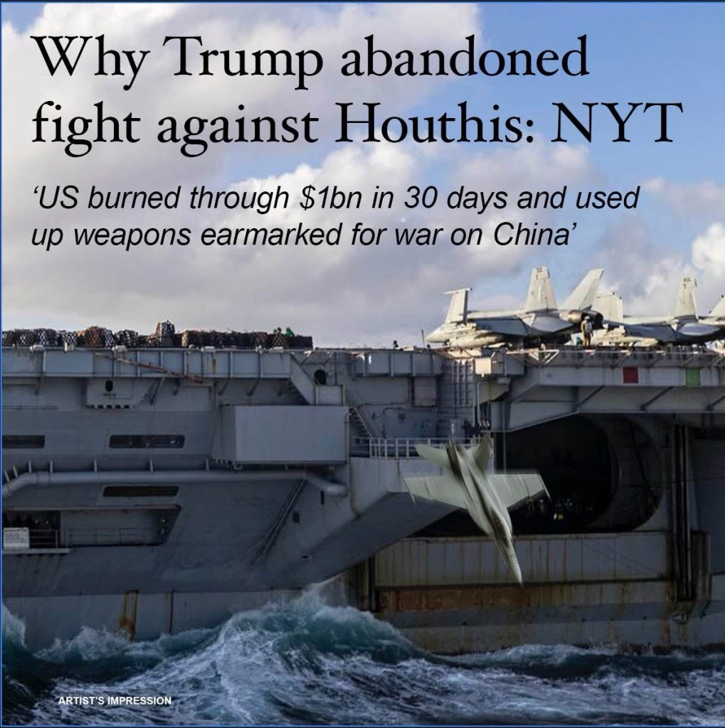 US has no money & with inferior weapons: Donald Trump halted the US-UK bombing of the Houthis in Yemen after realizing that US$1 billion had been spent in the first 30 days, the New York Times reported this morning (surprise that NYT fake news media willing to tell the truth) 美國沒錢,武器也差:根據《紐約時報》今早報道,唐納德·特朗普在意識到前 30 天已經花費了 10 億美元後,停止了美英對也門胡塞武裝的轟炸(令人驚訝的是,《紐約時報》的假新聞媒體願意說實話)