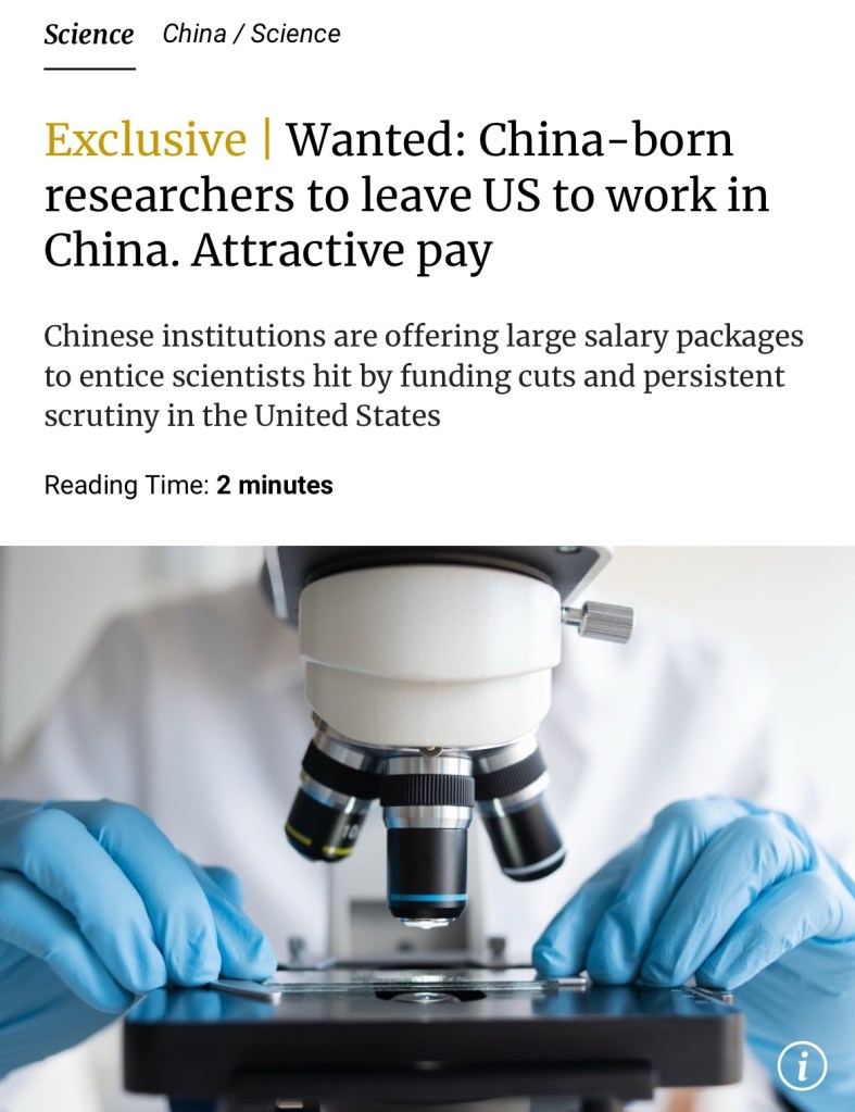 Are you smart, educated and born in China currently in US, but unhappy about the Asian hates, discrimination, violent crimes and funding cut simply because you are Chinese? China is launching dedicated recruitment programmes to lure Chinese-born researchers who are considering leaving the United States, a source told the South China Morning Post 你是否聰明、受過良好教育、出生在中國,目前在美國,天天面對亞裔仇恨、歧視、暴力犯罪以及僅僅因為你是中國人就被削減科研經費感到不滿?一位消息人士告訴《南華早報》,中國正在推出專門的招聘計劃,以吸引那些考慮離開美國的中國出生的研究人員.