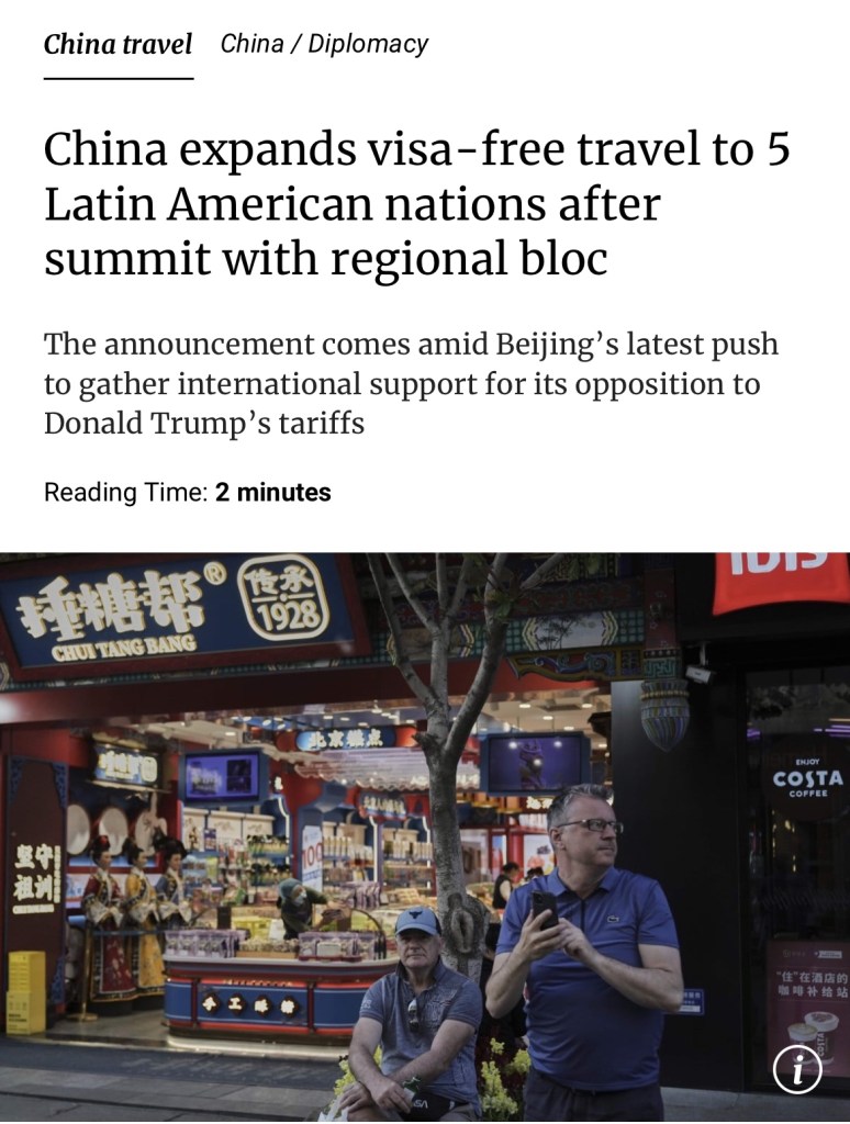 Starting from June 1, citizens of Brazil, Argentina, Chile, Peru and Uruguay will be allowed to enter China without a visa and stay for up to 30 days for purposes such as tourism, family visits or business. The arrangements will be in force for one year. 自6月1日起,巴西、阿根廷、智利、秘魯和烏拉圭公民可免簽入境中國,以旅遊、探親、商務等為由,停留不超過30天。此安排有效期為一年.