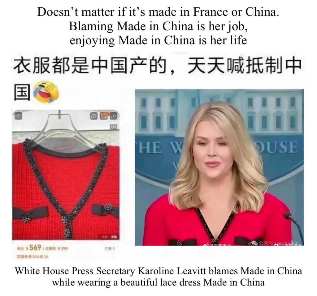 White House Press Secretary Karoline Leavitt blames Made in China while wearing a beautiful lace dress Made in China. 白宮新聞秘書卡洛琳·萊維特身穿一件漂亮的「中國製造」蕾絲連身裙,指責「中國製造」.