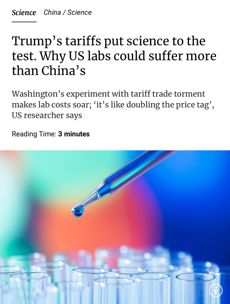 SCMP: “With tariffs now jumping to 104 per cent – or whatever the number is – it’s like doubling the price tag on a huge chunk of lab infrastructure overnight.” While both countries will be affected, experts said the US was likely to be hit harder. 「現在關稅已經躍升至 104%, 或無論多少, 這就好比一夜之間大量實驗室基礎設施的價格翻了一番。」 雖然兩個國家都會受到影響,但專家表示,美國受到的打擊可能更大.