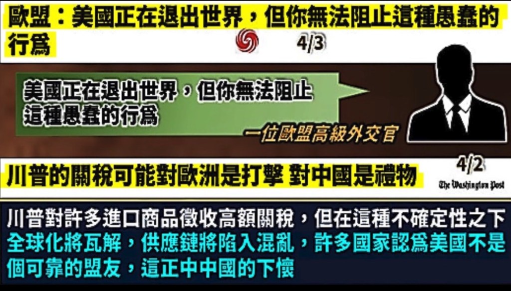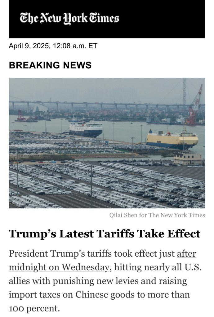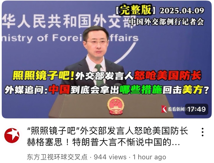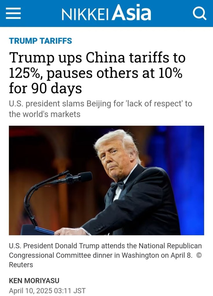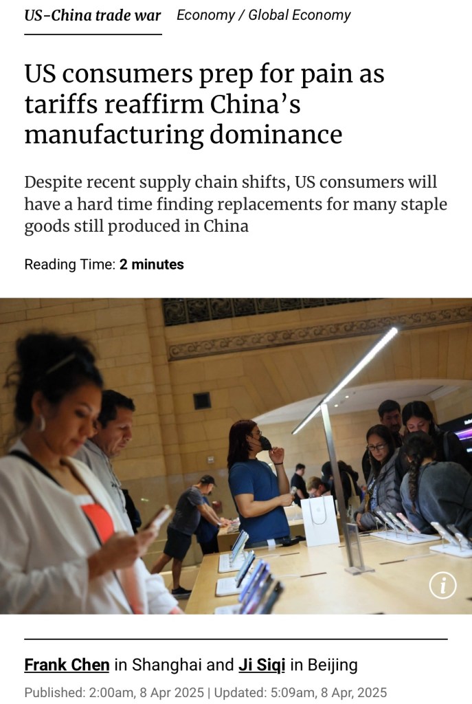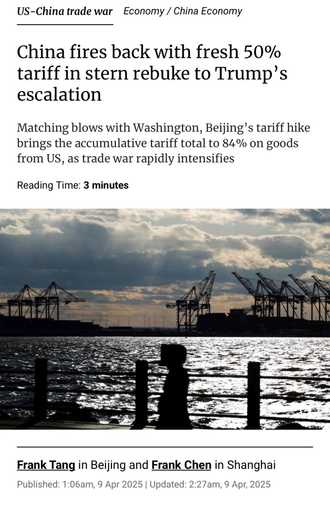 SCMP: Extortion by US won’t work for China! China will impose 50 per cent tariffs on all American imports – in addition to existing levies. Beijing’s move marked a clear signal that it would resolutely defend its interests and fight to the end. 南華早報:美國敲詐勒索對中國沒用!中國將在現有關稅基礎上,對所有美國進口產品徵收 50% 的關稅。北京此舉明確釋放訊號,堅決捍衛自身利益,戰鬥到底.