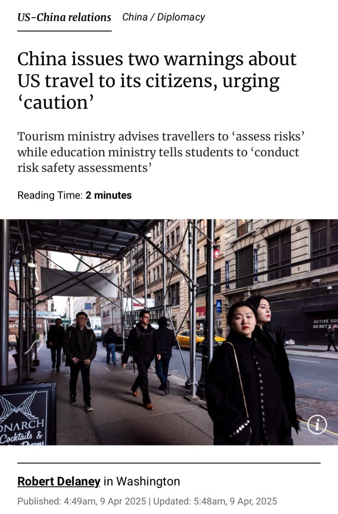 US lawyers and consultants are strongly advising their China, HK and Macau clients including those with Chinese last names from any country to cancel their US trip including transit through US borders by cars, sea ports and airports. It is not safe to come to US in the foreseeable future. SCMP: China’s government on Wednesday issued two warnings to its citizens about travel to the United States, noting a deterioration in bilateral relations as the two countries slap hefty tariffs on each other’s imports. 美國律師和顧問強烈建議其在中國、香港和澳門的客戶(包括來自任何國家的具有中文姓氏的客戶)取消前往美國的行程,包括乘坐汽車、海港和機場過境美國邊境要馬上停止,在可預見的未來遠離美國,來美國絕對不安全。南華早報:中國政府週三向公民發出兩項前往美國的旅行警告,指出由於兩國對彼此的進口產品徵收高額關稅,雙邊關係惡化.