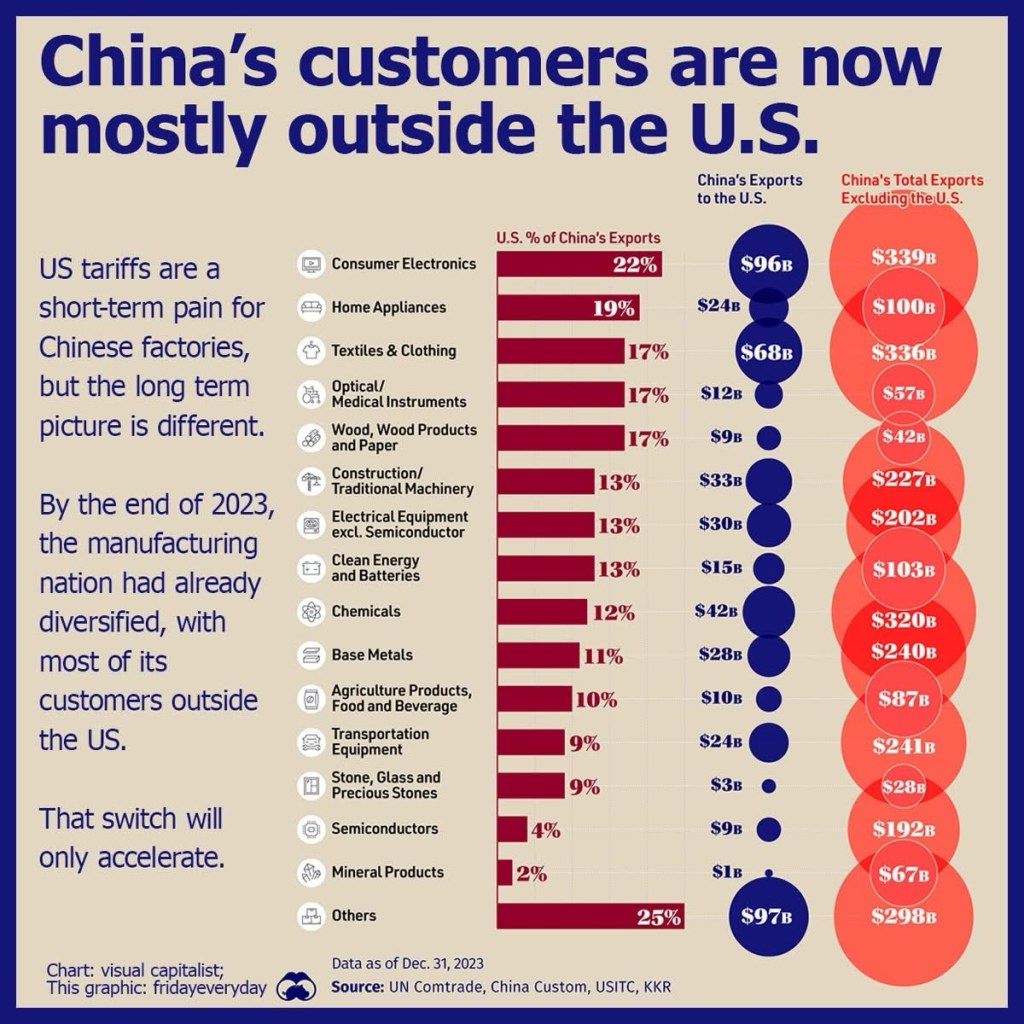Commentators may be right in saying that the huge tariffs will immediately dent China’s economy, which includes a lot of manufacturing for the US market, but they are missing the fact that the world is a big place and 19 out of 20 humans don’t live in the US. China sells more outside the US than inside, as the chart shows.