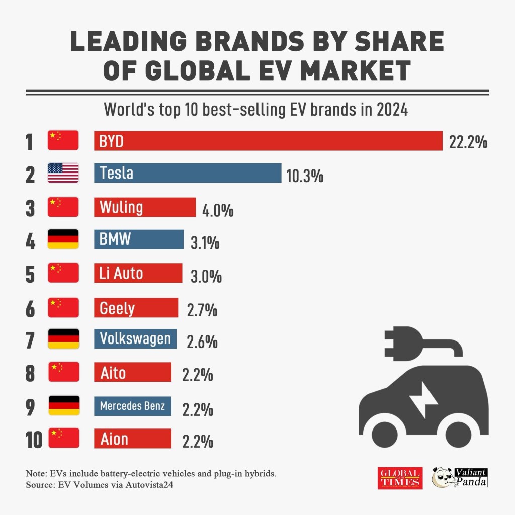 China’s BYD overtook Tesla in 2024 annual revenue. 6 of the world’s top 10 best-selling EV brands in 2024 were Chinese. 中國的比亞迪將在2024年年收入超越特斯拉。 2024年全球最暢銷的10個電動車品牌中,有6個是中國品牌.