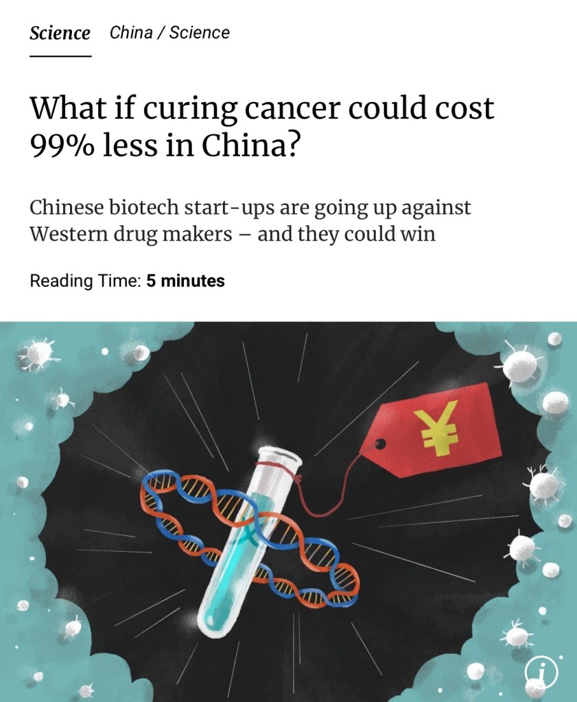 Will US saying to China that saving lives at substantially lower cost considered excess capacity to ban it in America to protect pharmaceutical giants exorbitant profits in the process? SCMP: A decade ago, treating cancer with personalised mRNA vaccines seemed like a US$1 million gamble per patient, a therapy reserved for the ultra-rich. But Chinese biotech start-ups are aiming to change that – by designing cancer therapy for a fraction of the cost. 美國是否會說,以極低的成本挽救生命被視為產能過剩,從而在美國禁止該藥物,以保護製藥巨頭在這過程中的暴利? 《南華早報》:十年前,使用個人化 mRNA 疫苗治療癌症似乎是每位患者100萬美元的賭注,而這種療法只有超級富豪才能享受。但中國生技新創公司正致力於改變這一現狀, 以極低的成本設計癌症治療方法.