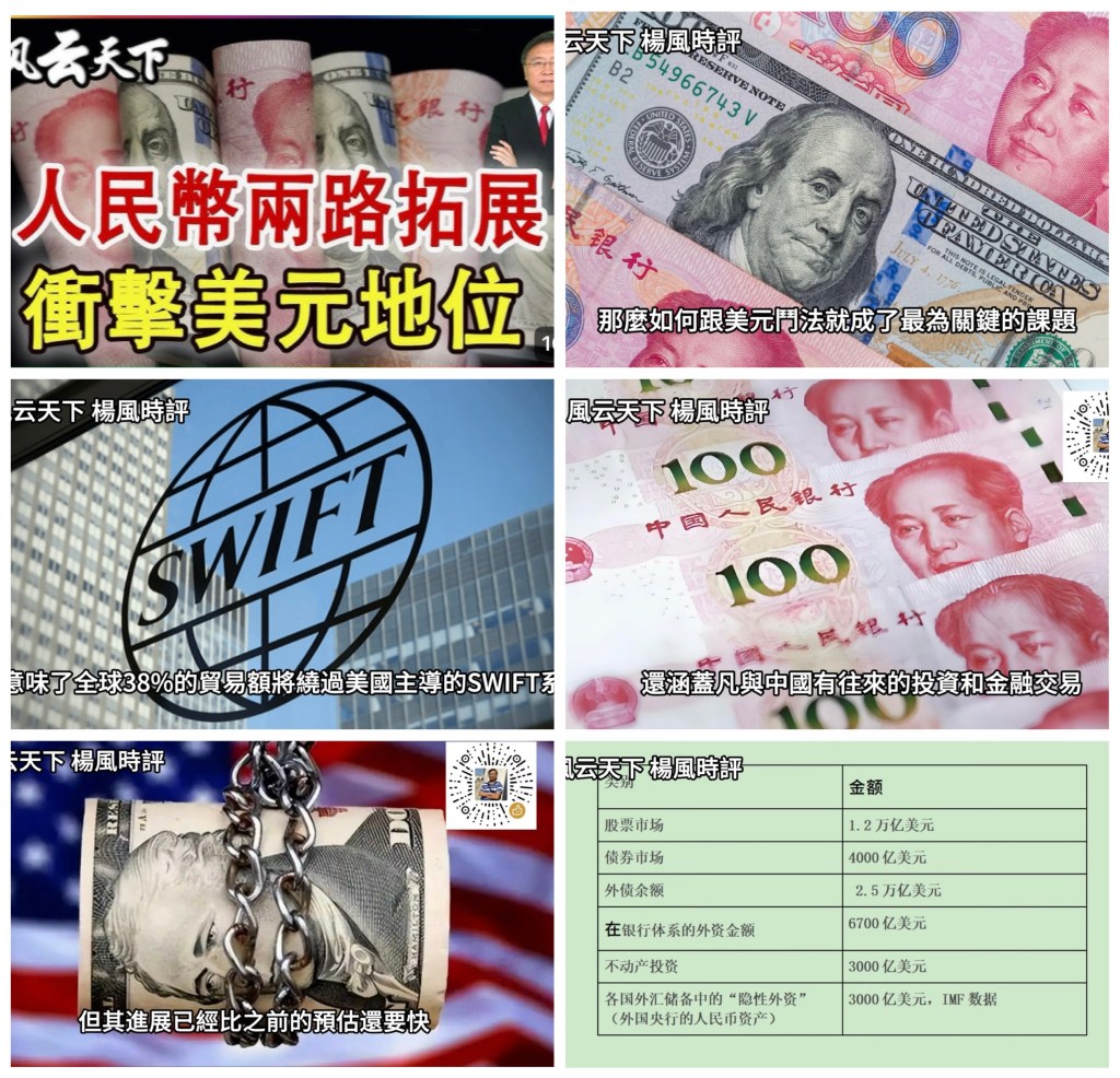 Taiwan US China expert video: The RMB is expanding globally, the US dollar hegemony is facing an impact, and the global de-dollarization is accelerating. Be careful that your dollarized assets may not be safe. Many wealthy Chinese and white Americans in the United States have already converted some of their liquid assets into RMB six months ago. They have already made great gains by selling US stocks and investing in the Chinese and Hong Kong stock markets. They put their liquid assets in non-US banks to reduce risks. 台灣中美尊家視頻: 人民幣全球擴張,美元霸權面臨衝擊,全球去美元化加速,當心你的美元化資產可能不保,不少在美國有錢的華人和美國白人在六個月前已經把部分可動產轉為人民幣,賣掉美國股票轉投中國和香港股市已經大有收穫,把流動資產放在非美國體系的銀行以減輕風險.