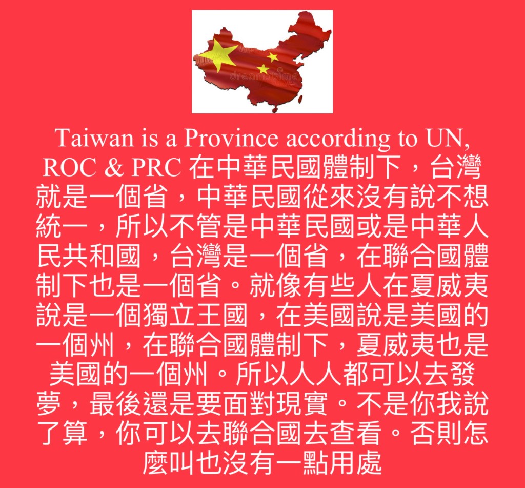 Taiwan is a Province according to UN, ROC & PRC 在中華民國體制下,台灣就是一個省,中華民國從來沒有說不想統一,所以不管是中華民國或是中華人民共和國,台灣是一個省,在聯合國體制下也是一個省。就像有些人在夏威夷說是一個獨立王國,在美國說是美國的一個州,在聯合國體制下,夏威夷也是美國的一個州。所以人人都可以去發夢,最後還是要面對現實。不是你我說了算,你可以去聯合國去查看。否則怎麼叫也沒有一點用處