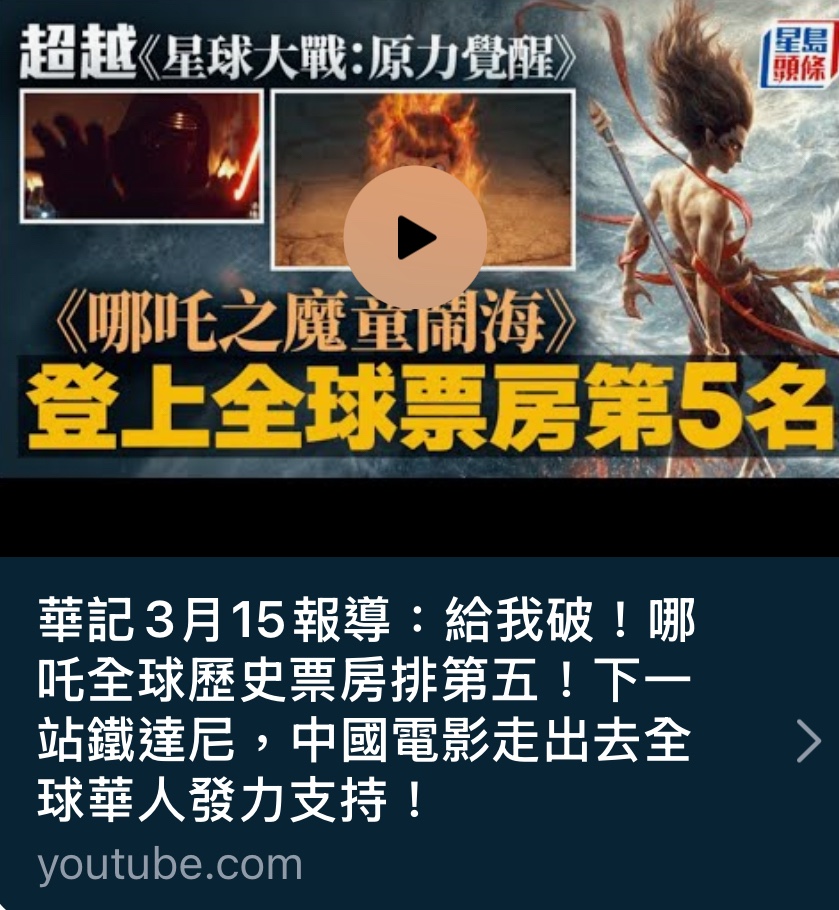 Alex Yeung Channel video on Nezha 2: The Devil Boy has ranked 5th in the global box office. If you are Chinese, supporting Nezha 2 is supporting yourself. Tell Hollywood and the racist Americans white supremacists that the Chinese can beat you. The United States has no right to talk down to China. The Chinese will not accept this anymore! 哪吒2之魔童閙海登上全球票房第5名,如果你是中國人,你支持哪吒2是支持你自己,告訴好萊塢,告訴白人至上的種族主義美國人,中國人可以打敗你. 美國沒有資格居高臨下和中國說話,中國人不吃這一套. https://www.youtube.com/live/qrAnBJXpXhM?si=JgzXQNjRSC5yzkgQ 👈