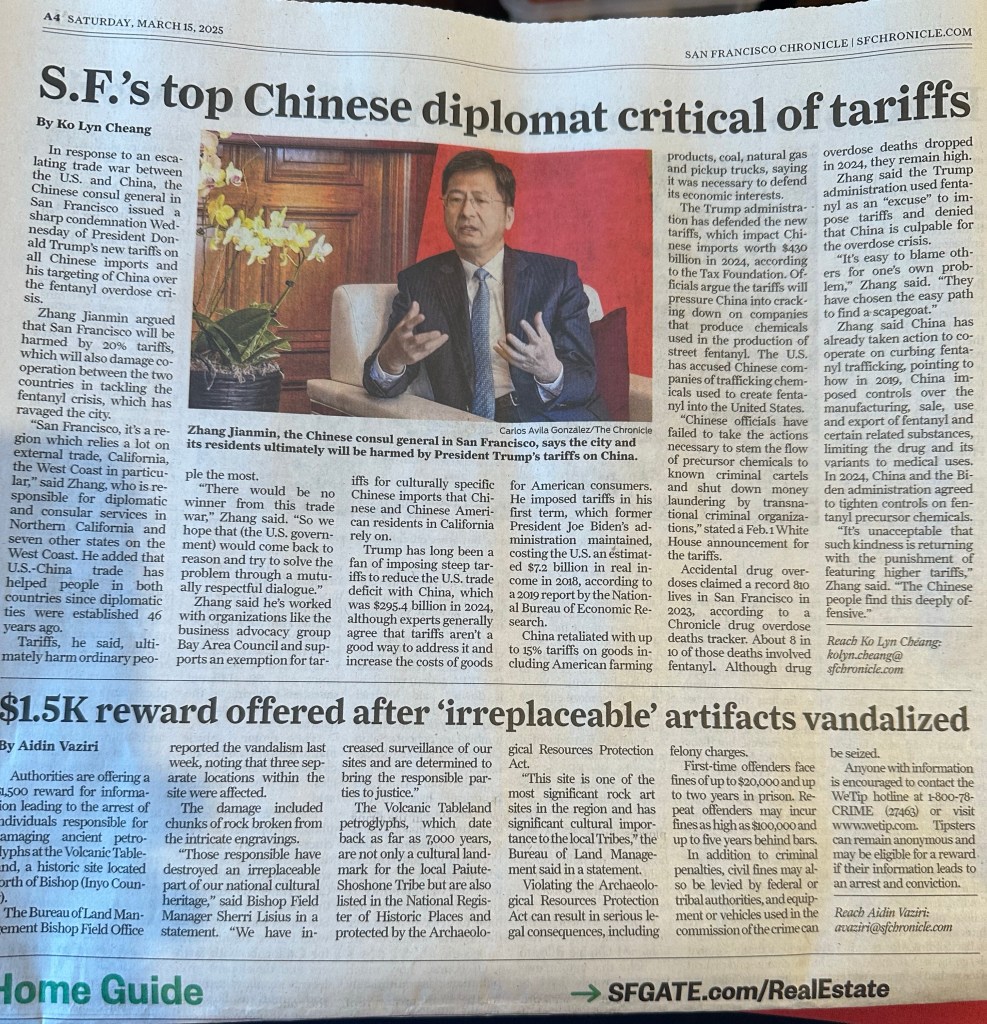 Today’s SF Chronicle Excellent article. As usual Chinese Consul General Zhang was articulate, persuasive and very sincere in his urging for more cooperation and less tariffs which would end up “harming ordinary people the most”. The photo showed the pain and concern on his face and his hand gestures demonstrated how much he cared about the issue. “A picture is worth a thousand words!” 今天的舊金山紀事報精彩文章。一如既往,中國註舊金山總領事張軍的演講清晰、有說服力,非常真誠地呼籲中美雙方加強合作,減少最終「損害普通民眾利益」的關稅。照片顯示他臉上的痛苦和擔憂,他的手勢顯示他對這個問題有多關心。 “一張圖片勝過千言萬語!”