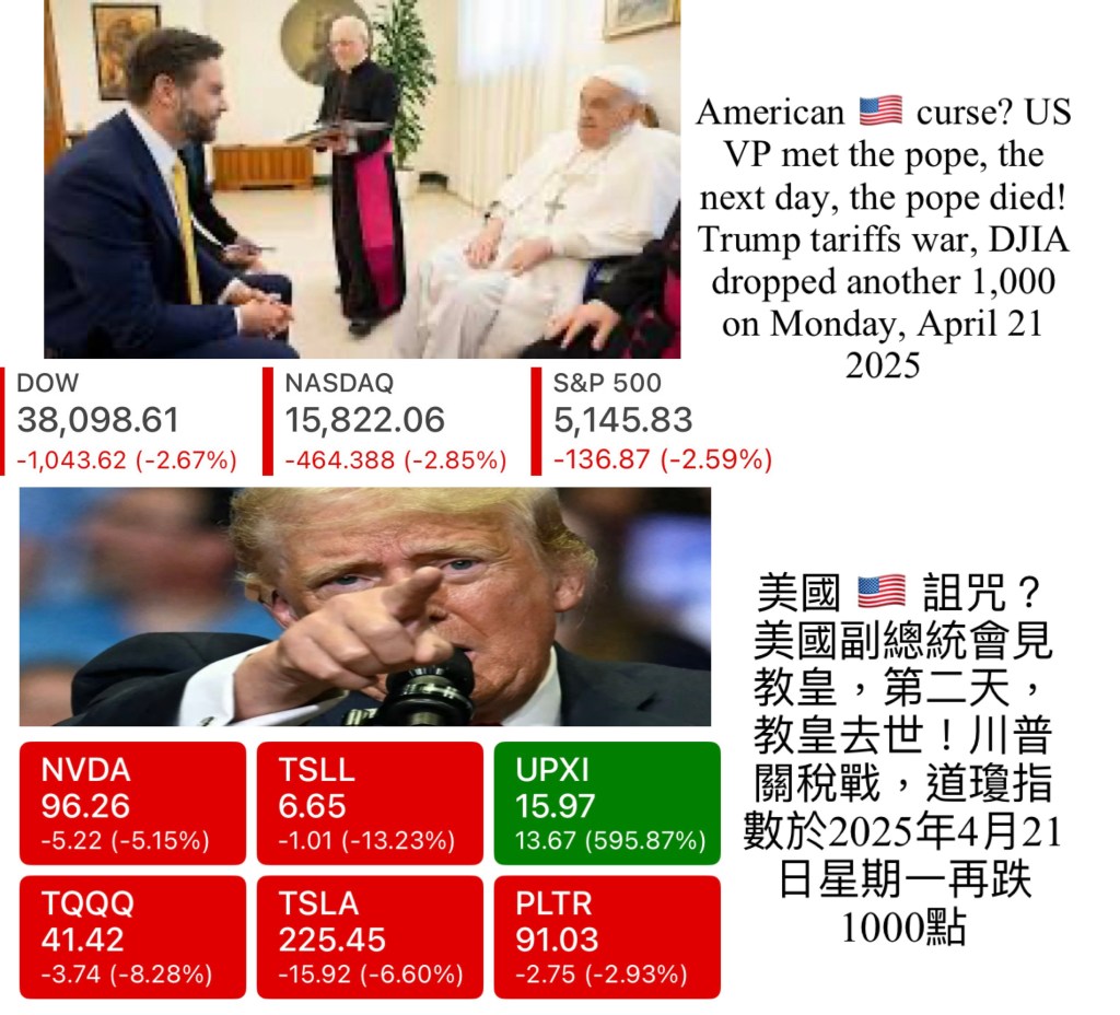 American 🇺🇸 curse? US VP met the pope, the next day, the pope died! Trump tariffs war, DJIA dropped another 1,000 points on Monday, April 21 2025 美國🇺🇸 詛咒?美國副總統會見教皇,第二天,教皇去世!川普關稅戰,道瓊指數於2025年4月21日星期一再跌1000點