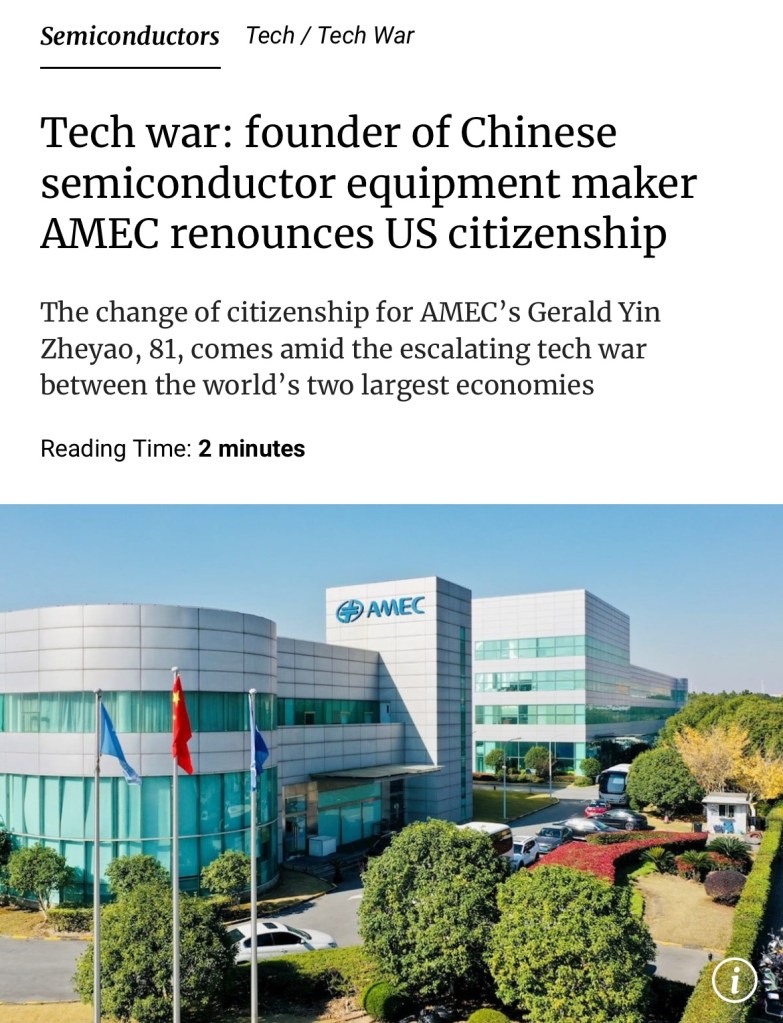 SCMP: The founder, chairman and chief executive of Shanghai-based Advanced Micro-Fabrication Equipment (AMEC), Gerald Yin Zheyao, has renounced his US citizenship and restored his Chinese nationality 《南華早報》:上海中微半導體設備有限公司(AMEC)創辦人、董事長兼執行長尹哲耀已放棄美國國籍,恢復中國國籍.