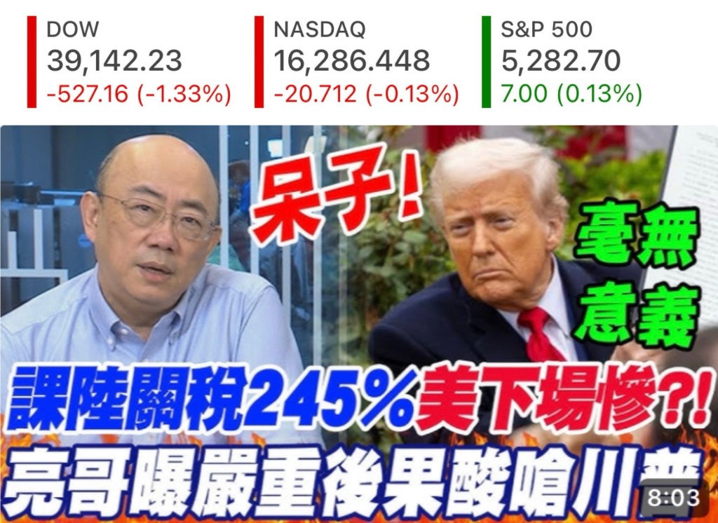 Trump increase tariffs against China to 245%, DJIA rewards Trump with a drop of -700 points. Trump if you Keep it up will bankrupt America 川普將對華關稅提高至245%,道瓊指數下跌-700點。川普如果繼續這樣下去,美國不破產才怪.