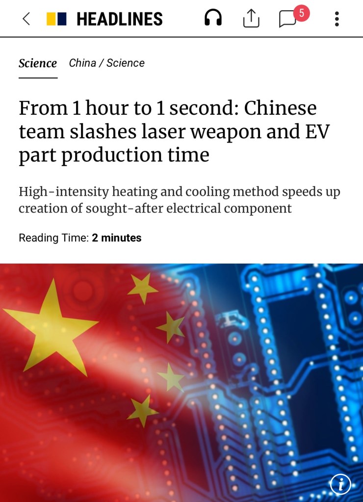 SCMP: Chinese scientists have reduced the production time of dielectric energy storage capacitor components to just one second, enabling scalable, temperature-stable storage for hybrid electric vehicles, radar systems and high-power lasers. 南華早報:中國科學家將介電儲能電容器元件的生產時間縮短至僅一秒,從而實現了可擴展、溫度穩定的儲能,可用於混合動力電動車、雷達系統和高功率雷射.