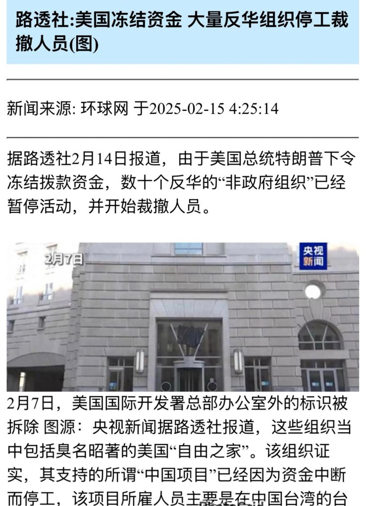 China hate groups funding cut off after Elon Musk shut down USAID 美国的大戏继续上演。一个有趣的现象是:由于川马对美国联邦资金的冻结,很多反华机构不得不停止了活动,他们的不少员工被裁掉了。另外,一些以前支持川普上台的美国人,包括美籍华人,现在以肉眼可见的速度转向反川方向了。所以后面的变化会越来越戏剧性。请继续期待哟!