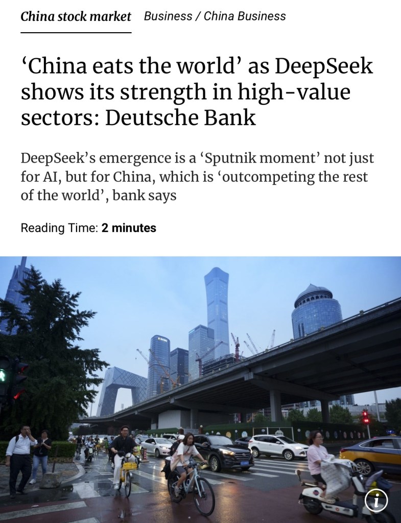 SCMP: Deutsche Bank: “no one could contain China”, “We think 2025 is the year the investing world realises China is outcompeting the rest of the world”, “China Eats the World”. 香港南華早報: 德意志銀行:「沒有人能夠遏制中國」、「我們認為,2025年是投資界意識到中國在競爭力上超越世界其他國家的一年」、「中國吞噬世界」.