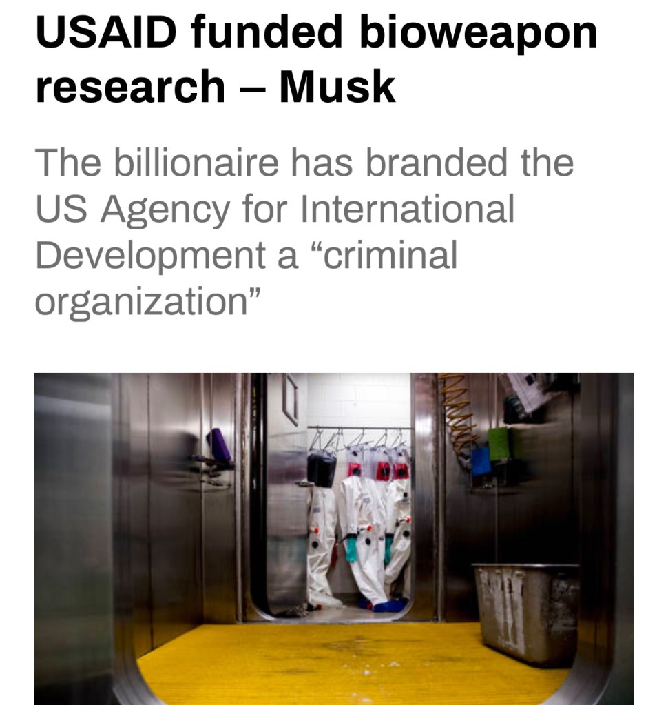 The US Agency for International Development (USAID) is a “criminal organization” that financed bioweapon research, including projects that allegedly led to the emergence of Covid-19, according to Trump-ally Elon Musk. 川普盟友伊隆馬斯克稱,美國國際開發署(USAID)是一個資助生物武器研究的“犯罪組織”,其中包括據稱導致新冠病毒出現的項目.