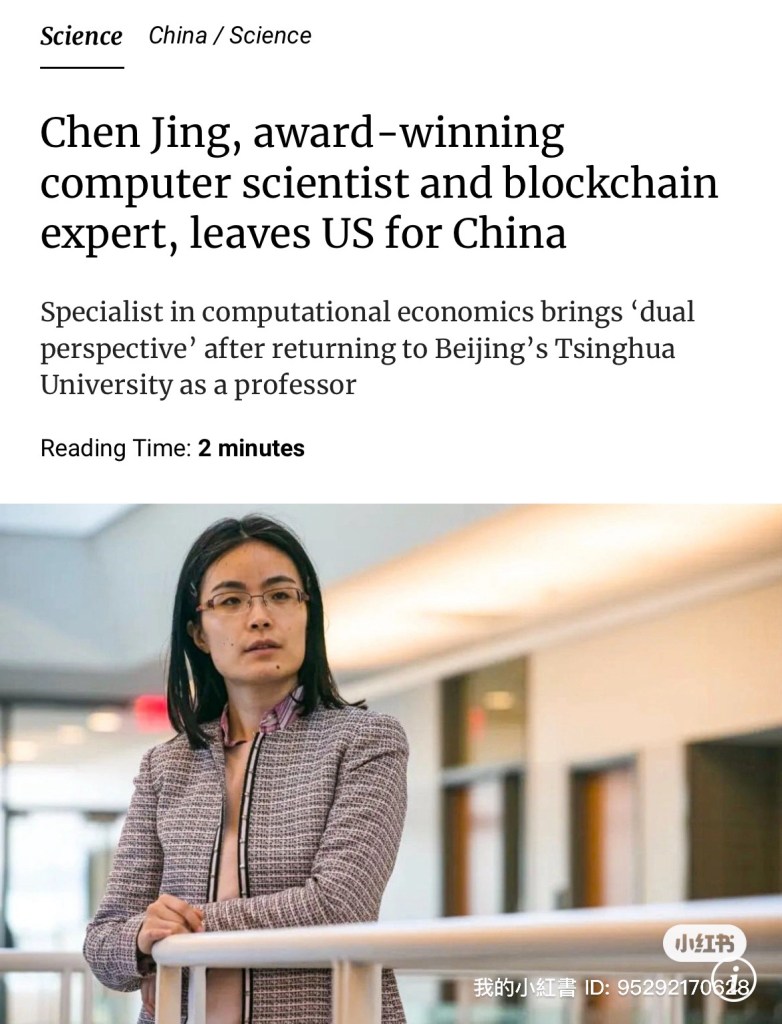 Another smart Chinese left US to return to China! 30 years ago used to be the opposite. Now the not so smart and corrupt Chinese former/current Chinese Gov’t officials wanted to come to US. Prominent blockchain researcher Chen Jing has left the United States to join Tsinghua University in Beijing as a full-time professor. 又一位聰明的美國華人離開美國回到中國! 30年前的情況則恰恰相反。現在,不那麼聰明和腐敗的中國前任/現任政府官員都想來美國。著名區塊鏈研究員陳靜離開美國,加入北京清華大學擔任全職教授. 非常聰明的選擇.