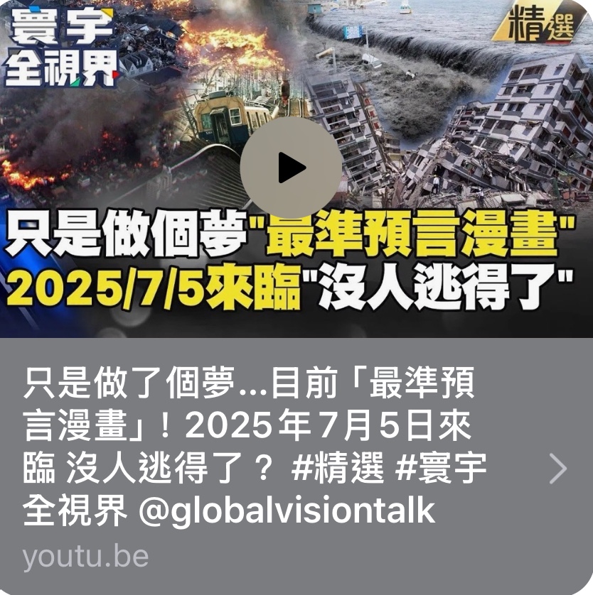 Taiwan Mandarin video: She was right half-dozen times before. July 2025 stay clear of Japan, Taiwan, HK and Philippines, there will be disasters in historic proportions 她的預言非常準確, 今年七月,千萬不要去日本,香港,台灣和菲律賓, 會有災難性的天災發生,不能不信 https://youtu.be/4WyVvwAG8tM 👈
