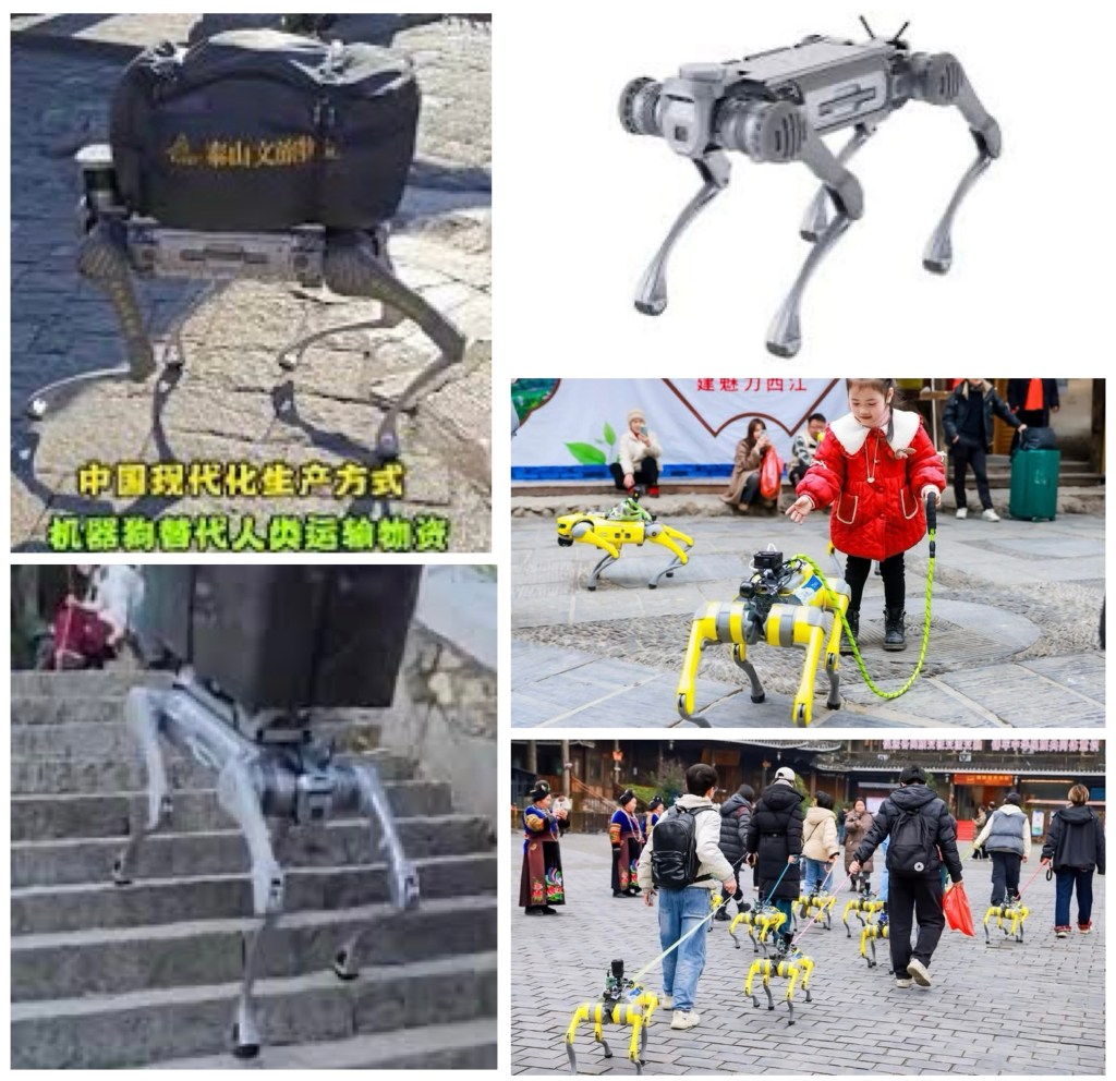 China’s AI Robot Dog: a small one as pets and a big one to help carry foods/bags in Chinatown, Supermarket, or shopping mall so men no need be donkey for wife! 中國的人工智慧機器狗:小型的作為寵物,大型的則幫助在唐人街、超市或購物中心攜帶食物/袋子. 那麼男人沒必要當老婆的驢,好辛苦呀!