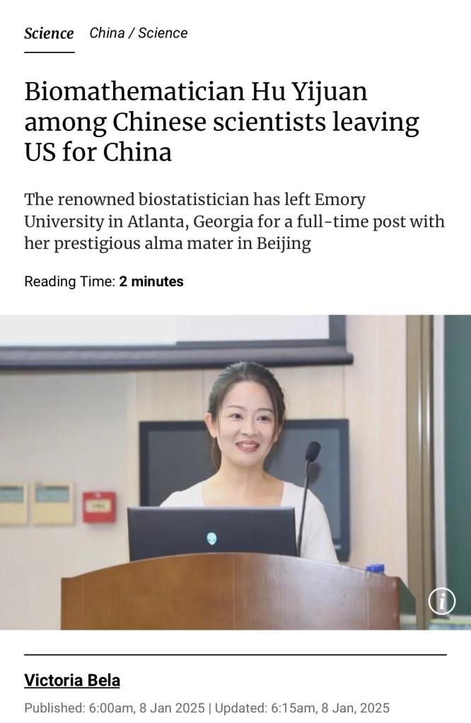 From Google: According to Stanford University, recent years, a significant number of top Chinese scientists have left the US and returned to China, particularly due to concerns about the “China Initiative” which led to increased scrutiny and suspicion towards researchers of Chinese descent, causing many to feel unwelcome in the US academic landscape; this trend has seen prominent scientists in fields like computer science and life sciences move back to China to take up high-profile positions at leading Chinese universities like Tsinghua University, contributing to a “reverse brain drain” effect. 來自Google:據史丹佛大學, 近年來,大量中國頂尖科學家離開美國並返回中國,特別是由於對「中國計畫」的擔憂,這導致對華裔研究人員的審查和懷疑日益增加,導致許多人在美國學術界感到不受歡迎;這一趨勢導致電腦科學和生命科學等領域的傑出科學家回到中國,在清華大學等中國頂尖大學擔任高階職位,從而產生了「逆向人才流失」效應.