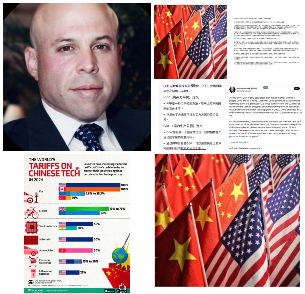 “中國的 PPP GDP僅比美國高 25%?拜託大家……我們在騙誰呢?(他是不是說美國人自己在自欺欺人?)去年,中國發電量是美國的兩倍,鋼鐵產量是美國的12.6倍,水泥產量是美國的22 倍。中國造船廠占世界產量的50%以上,而美國產量微不足道。2023 年,中國生產了 3020萬輛汽車,幾乎是美國1060萬輛的三倍。