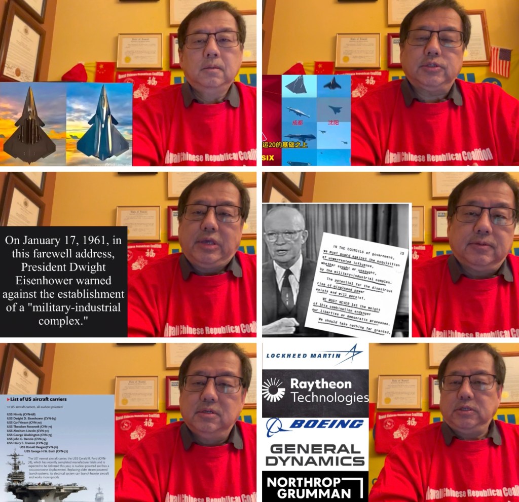Video: Johnson Choi reports from SF on Jan 6 2025. China 6th generation fighter aircraft has invited a lot of discussions. On 1/17/1961 in this farewell address, President Eisenhower warned against the establishment of a “military-industrial complex. (MIC)” Today the MIC is destroying US military readiness. MIC is a for profit giant controlling the US Government. 中國第六代戰鬥機引起了很多討論. 1961 年 1 月 17 日,美國艾森豪威爾總統在告別演說中警告不要建立“軍工聯合體.” 今天,軍工聯合體 正在破壞美國的軍事準備。軍工聯合體是控制美國政府的營利巨頭.