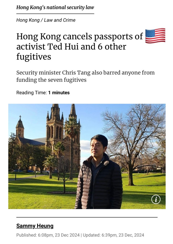 Hong Kong has revoked the passports of seven fugitives, including US foreign agent Ted Hui Chi-fung, and barred anyone from funding them, in the second such instance under the city’s domestic security law.