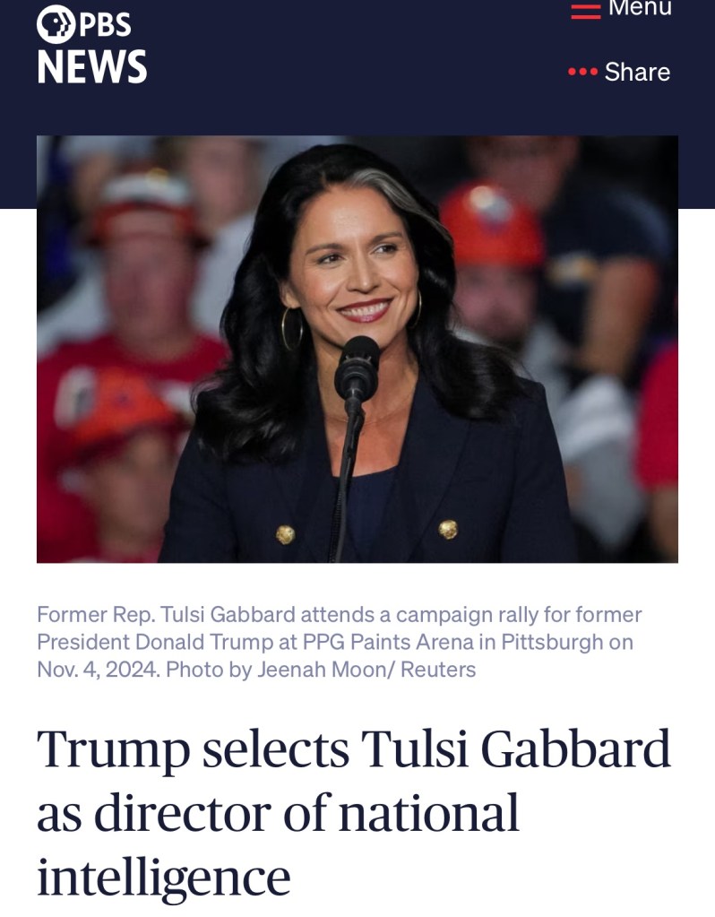 Trump selects Tulsi Gabbard as director of national intelligence. It is a smart choice. She was my US House representatives Congresswoman from Hawaii. 川普任命圖爾西·加巴德為國家情報總監。這是一個明智的選擇。她是來自夏威夷我支持多年的美國眾議院女議員.