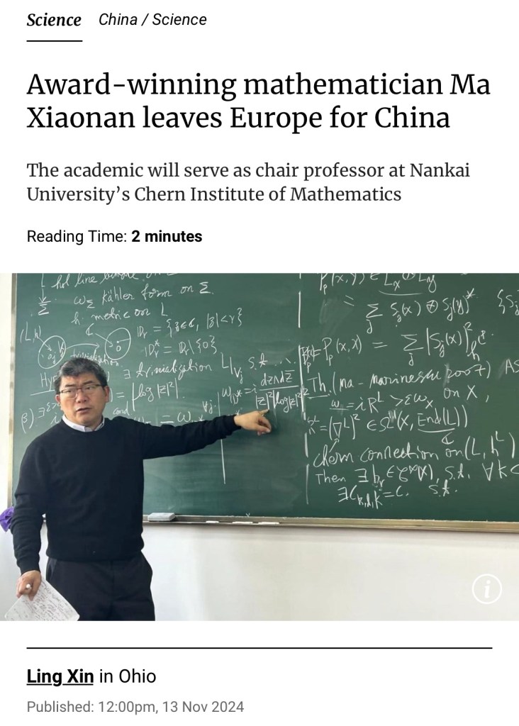 As I have predicted, the smart and with brains are leaving US & EU to return to China! Award-winning Chinese mathematician Ma Xiaonan has left his decades-long career in Europe to join Nankai University in Tianjin. 正如我所預料的,聰明有頭腦的人正在離開美國和歐盟回到中國!屢獲殊榮的中國數學家馬曉楠離開了他在歐洲數十年的職業生涯,加入了位於天津的南開大學. 東升西降已經成為正局.