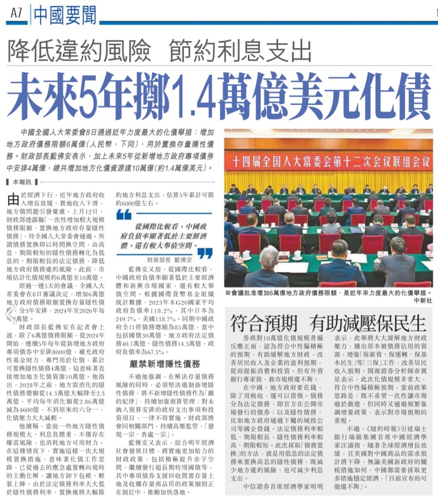 Beijing will provide US$1.4 trillions next 5 years to relief debt pressure face by local governments