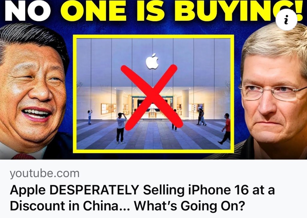 Anyone want to buy Apple 16 in US, don’t! Because you can buy it at a discount in China. And you won’t be buying one made by India in China. If you live in California, you will also save the 9.5% sales tax. That is a saving of US$200+. Apple is no longer top 5 mobile phone in China. Companies like Intel also hurting as China no longer use Intel chips in the computer. Intel chips, Apple iPhone and all communication equipments produced by US have backdoors to allow US to spy on everyone. The only communication equipment and mobile phone without backdoor are those produced by Huawei. If everyone uses Huawei, US will be blindsided. That is why US desperately wanting to kill Huawei. 任何人想在美國購買Apple 16手機,不要!因為在中國可以打折買到。而且你不會在中國購買印度製造的欠佳產品。如果您居住在加州,您還可以節省 9.5% 的銷售稅,共節省省 200+ 美元. 蘋果不再是中國前五名的手機。由於中國不再在電腦中使用英特爾電腦晶片,英特爾等公司也受到了影響。英特爾晶片、蘋果iPhone以及美國生產的所有通訊設備都有後門,讓美國可以監視所有人。唯一沒有後門的通訊設備和手機是華為生產的。如果大家都用華為,美國就不能監視全球。這就是為什麼美國拼命想幹掉華為.
