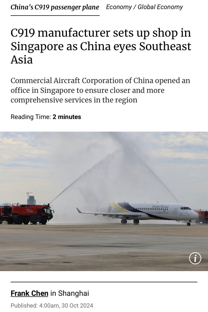 China’s leading aircraft manufacturer opened an Asia-Pacific office in Singapore this week, marking a significant step toward challenging Boeing and Airbus in the international aviation market. 中國領先的飛機製造商本週在新加坡開設亞太辦事處,標誌著在國際航空市場挑戰波音和空中巴士的重要一步.