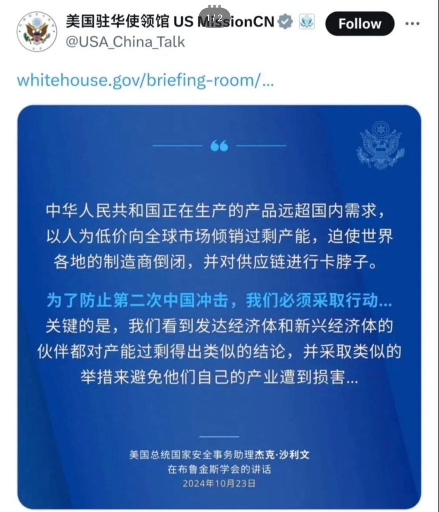 The U.S. Embassy and Consulate in China wrote on October 25th 👉Final conclusion: The only country with overcapacity in the world is the U.S. dollar! 美國駐華使領館10月25日寫道……👉最後結論: 世界上產能過剩的只有美元!
