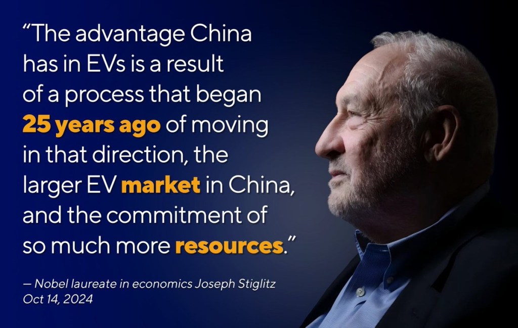 A good point made by US economist @JosephEStiglitz. China’s EV edge isn’t from subsidies—it’s 25 years of innovation, investment and market preparation. 美國經濟學家@JosephEStiglitz 提出了一個很好的觀點。中國的電動車優勢並非來自補貼,而是來自 25 年的創新、投資和市場準備.