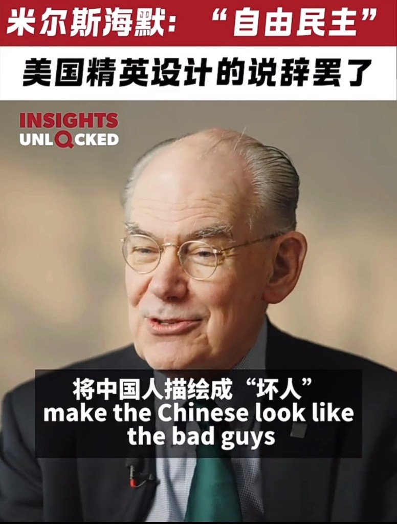 Video: Professor John Mearsheimer of University of Chicago: Why US demonize China? It is due to a shift of power from US to China. It is a design by US to make Chinese look bad. 芝加哥大學米爾斯海默教授:美國為何妖魔化中國? 這是由於權力從美國轉移到中國. 美國雖然知道自己輸定了,但是輸不起、這是美國為了讓中國人難堪而設計的. 無論如何美國是輸定, 哭泣也無用.