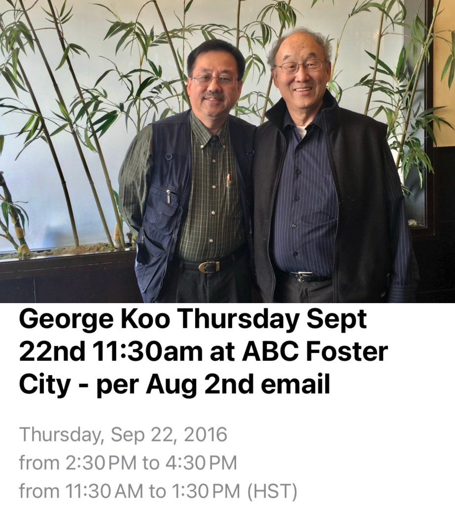 Just got the news about 10 minutes ago, George Koo has passed away on Tuesday due to head injury from a slip and fall on the pickle ball court. We have also lost Edward Liu, Esq., last year. Two US-China experts are gone, a big loss for us in the SF Bay Area.