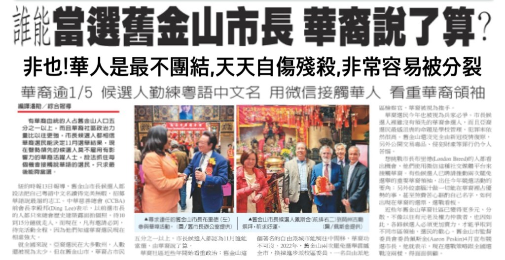 Chinese will decide next SF Mayor? Fantasy! Chinese engaged infighting everyday, just use split and destroy tactics to make them useless political force. There is a distinguished difference between Chinese and Jewish Americans in US. Both are competitive among themselves. For Jewish Americans, any politician attempt to proposed anything harmful to Israel, they shall become a unified force to remove those politicians from office. For Chinese Americans is exactly the opposite, many will support US politicians with a death wish on China. 誰能當舊金山市長, 華裔說了算? 非也! 華人是最不團結, 天天自傷殘殺,非常容易被分裂. 美國的華裔美國人和猶太裔美國人之間存在顯著差異。兩者之間都存在競爭。對猶太裔美國人來說,任何政客試圖提出任何對以色列有害的建議,他們都將聯合力量,將這些政客趕下台。但對華裔美國人來說則恰恰相反,許多美國華人會支持要摧毀中國的美國政客, 這就是我們歷史上稱之為漢奸走狗.