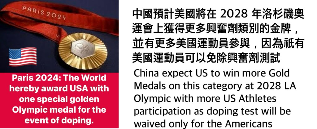 Video: China expect US to win more Gold Medals on this 💊💉category at 2028 LA Olympic with more US Athletes participation as 🔬 will be waived only for the Americans 中國預計美國將在 2028 年洛杉磯奧運會上獲得更多💊💉興奮劑類別的金牌,並有更多美國運動員參與,因為祇有美國運動員可以免除興奮劑🔬測試