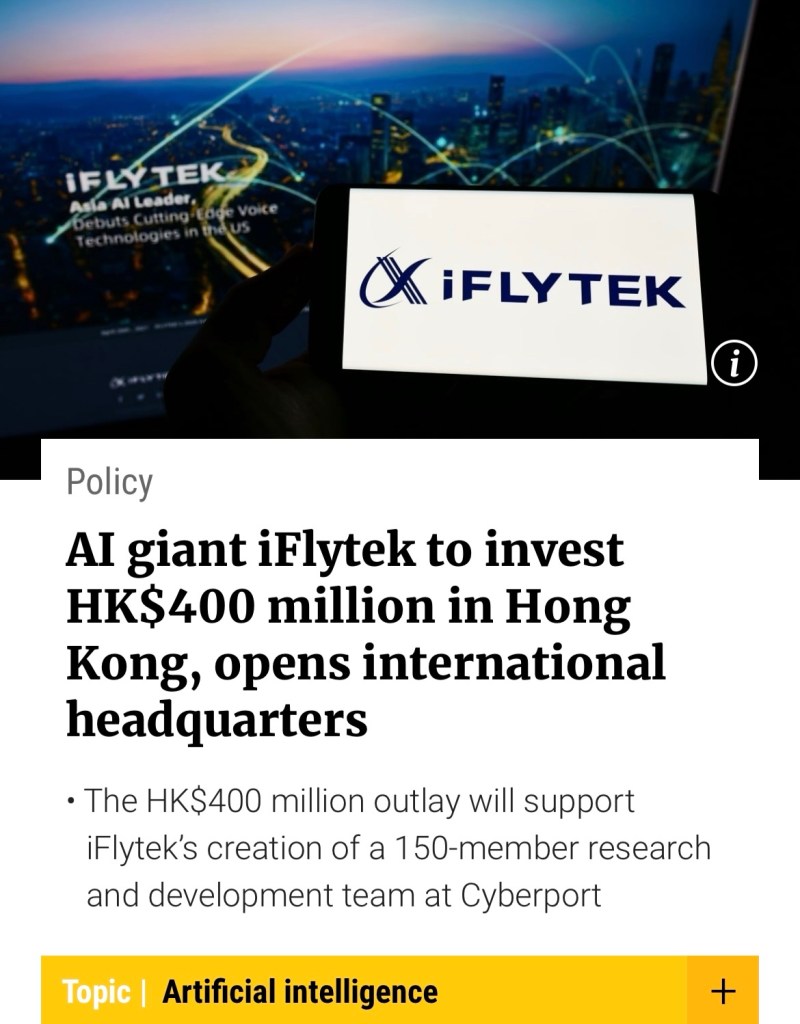10 years ago, tech firm like this would flock to Silicon Valley. Today no China tech firm goes to US, instead 100s of Chinese tech firms already in US left, followed by 1,000s of the best Chinese scientists and engineers. One of China’s original artificial intelligence (AI) champions, iFlytek, on Friday unveiled a five-year, HK$400 million (US$51.2 million) investment plan in Hong Kong, where the company has opened its international headquarters. 10 年前,這樣的科技公司紛紛湧入矽谷。如今,沒有一家中國科技公司進入美國,相反,已有數百家中國科技公司離開了美國,隨之而來的是數千名最優秀的中國科學家和工程師。中國最早的人工智慧(AI) 冠軍之一科大訊飛(iFlytek) 週五在香港公佈了一項為期五年、耗資4 億港元(5,120 萬美元)的投資計劃,該公司已在香港設立了國際總部.