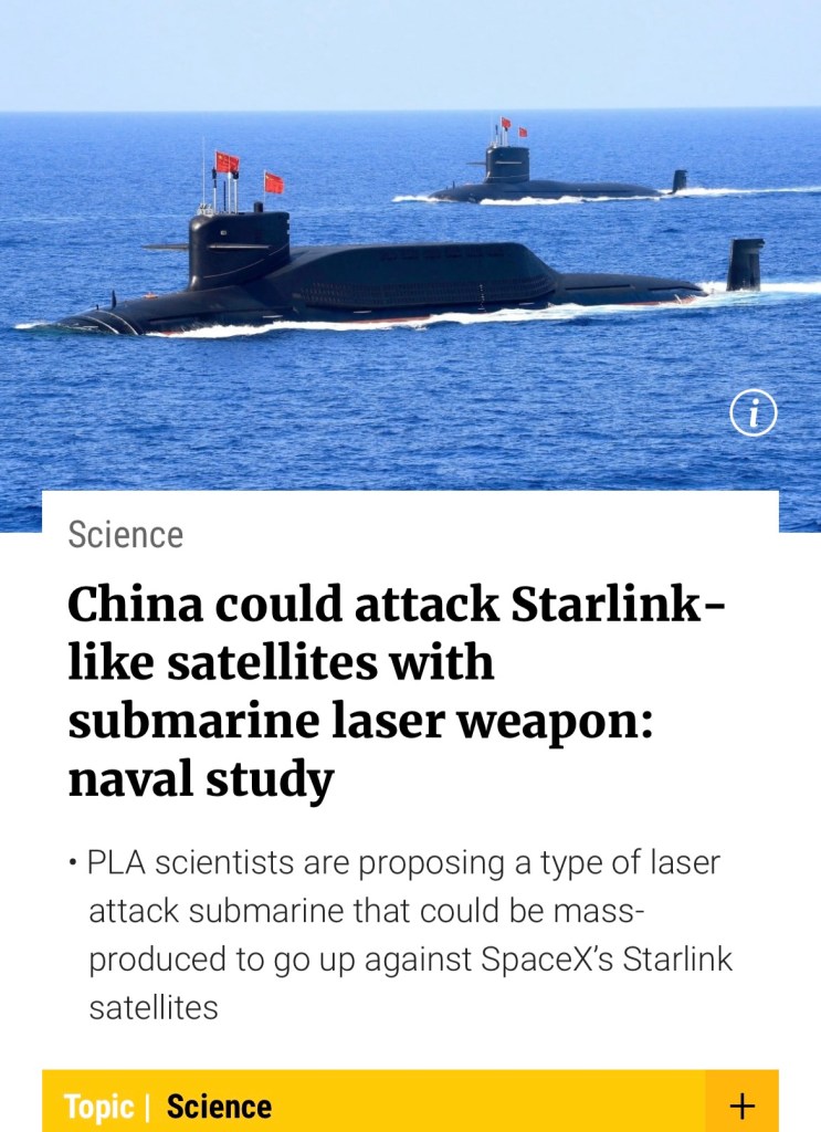 Chinese submarines armed with lasers could take out SpaceX’s Starlink satellites if China’s security was at risk, according to a study by People’s Liberation Army (PLA) scientists. This type of laser attack submarine could be mass-produced in the future and deployed in various oceans to counter military threats to China. 中國人民解放軍 (PLA) 科學家的一項研究表明,如果中國的安全受到威脅,配備雷射的中國潛艇可能會摧毀 SpaceX 的星鏈衛星。該型雷射攻擊潛艦未來可以大量生產並部署在各個海域,以對抗對中國的軍事威脅