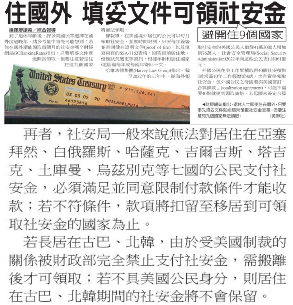 You don’t have to live in US to receive social security retirement income. But if you lived in the 9 countries who are enemies of US (China, HK & Macau not on the list yet), you could say goodbye to your social security 您不必居住在美國也可獲得社保退休收入。但如果你住在與美國為敵的9個國家 (中國, 香港和澳門暫時不在名單上),你就可以告別你的社保了!