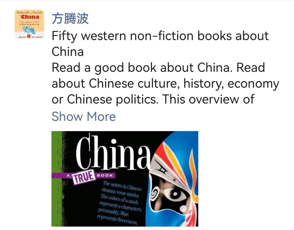 Fifty non-fiction books about China: “Not all recent, famous books about China are written with honest, veracious intentions.” 五十本有關中國的非小說類書籍:“並非所有近期有關中國的著名書籍都是出於誠實、真實的意圖而寫的.” By Frans Vandenbosch 方腾波 Jul 8 2024 https://yellowlion.org/fifty-non-fiction-books-about-china/ 👈