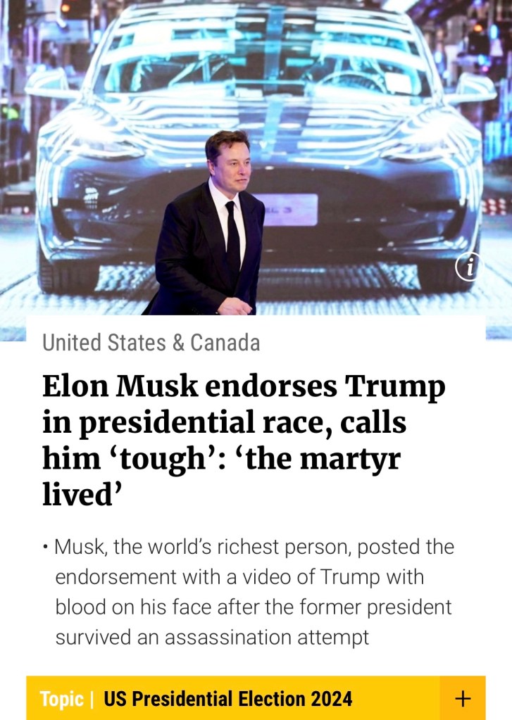 Elon Musk, the billionaire CEO of Tesla, publicly endorsed Donald Trump for the first time in the US presidential race, calling the Republican former president “tough”. 特斯拉億萬富翁執行長馬斯克在美國總統競選中首次公開支持唐納德·川普,稱這位共和黨前總統「強硬」.