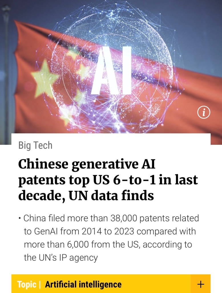 Debunk US fake news on Chinese copycat fantasies: China has surpassed the US in generative artificial intelligence (GenAI) patents, with 6 times as many filings in the decade 2014-2023, according to a report published on Wed by a UN agency. 揭穿美國關於中國山寨幻想的假新聞:根據聯合國機構週三發布的一份報告,中國在生成人工智慧(GenAI)專利方面已超過美國,2014年至2023年十年間申請數量是美國的六倍.