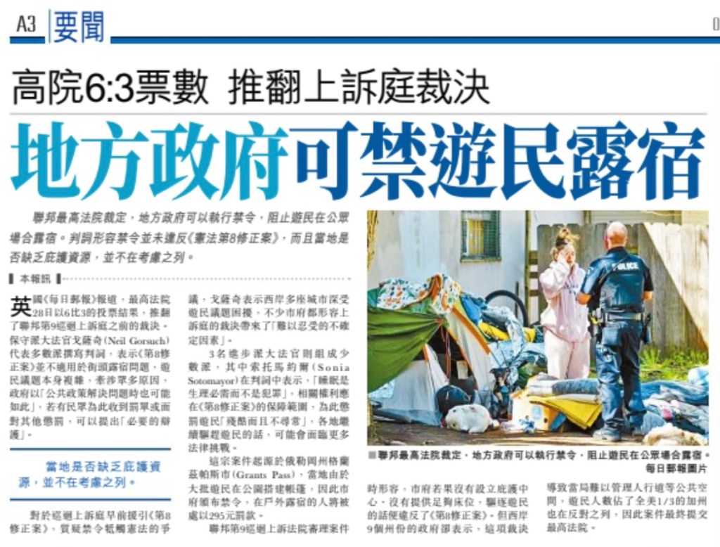 US Supreme Court with 6-3 vote permits local governments to ban homeless people occupying public and private lands, finally justice is being served. They could cause serious harm to local residents as many are drug addicts and many has mental illness. 美國最高法院以6票對3票允許地方政府禁止無家可歸者佔用公共和私人土地,正義終於伸張。這些人對當地居民帶來嚴重傷害,因為許多是吸毒者,也有許多是患有精神疾病者.