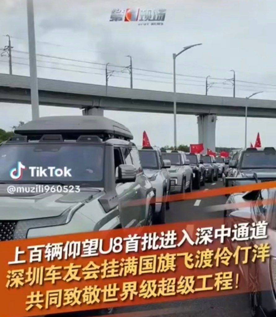Video: Hundreds of cars, the first batch of U8 EV vehicles entering the Shenzhen-Zhongshan Channel. Riders speed across Lingdingyang with Chinese flags to pay tribute to the world’s super project. 上百輛仰望U8首批進入深中通道, 深圳車友掛滿中國國旗飛渡伶仃洋, 共同致敬世界超級工程